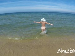 Si masturba sulla spiaggia per nudisti, squirta e poi cammina nuda per il mare davanti ai guardoni.