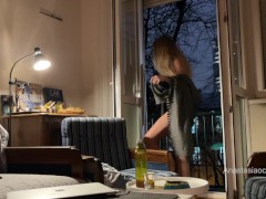 Hot wife walks naked in public, went out to the balcony to show her big boobs.