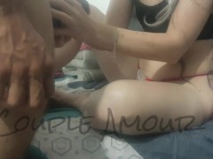 I masturbate my boyfriend's hard cock while he stimulates my pussy with his fingers and then I suck