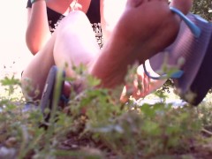 Nicoletta's sexy feet in the garden are wearing flip-flops