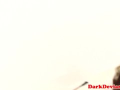 Cute CFNM Brit domina in black lingerie pegs BF in sauna