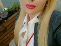 Horny luxury office blonde, lunch at a public cafe, craving showing pussy