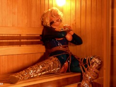 Latex Rubber Catsuit and Rope Bondage: hot blonde MILF trying to escape and masturbate wet pussy