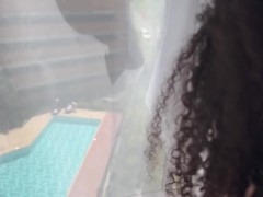 chica depravada se masturba en la ventana espiando a dos chicas en la piscina de su residencia